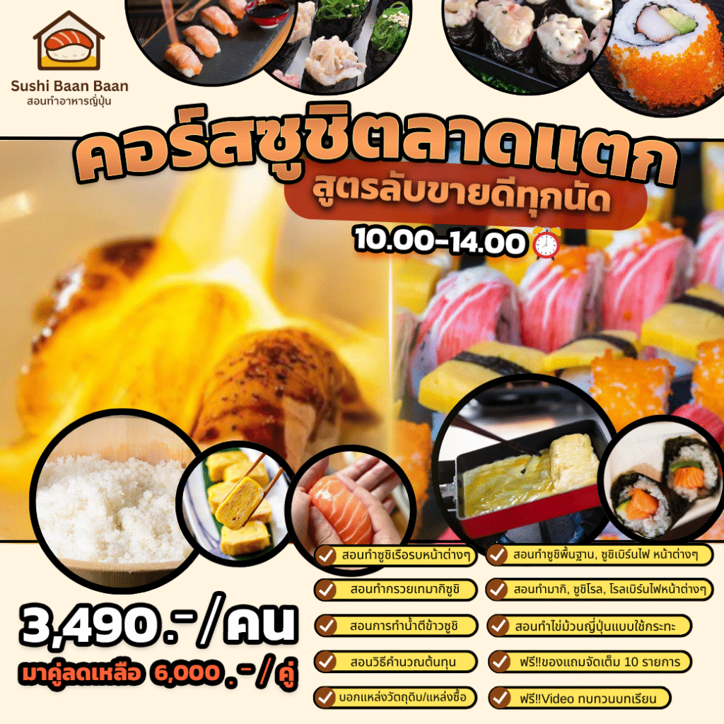 เรามีคอร์สที่สอนทุกขั้นตอน ตั้งแต่พื้นฐานการทำซูชิ, เทคนิคการปั้น ให้น่ากิน, วิธีเลือกวัตถุดิบ ไปจนถึงการคำนวนต้นทุน การจัดร้าน และไอเดีย เมนูขายดี สอนโดยเชฟผู้เชี่ยวชาญที่มีประสบการณ์ตรงจากแดน อาทิตย์อุทัยกว่า 15 ปี